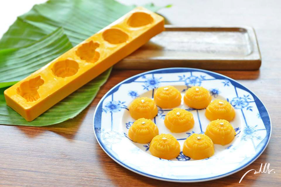 ไอหอมอ่อนๆบางเบาประดุจกลิ่นหอมจากกลีบอันบอบบางของดอกไม้นานาพรรณ แทรกซึมอยู่ในรสสัมผัสของขนมไทยสีเหลืองละมุน กลิ่นหอมของกะทิและน้ำตาลมะพร้าวถูกโอบอุ้มไว้ด้วยอ้อมกอดอันอบอุ่นของเนื้อขนมจากแป้งข้าวไทย ในขณะที่ดวงอาทิตย์ซึ่งเหมือนจะลับขอบฟ้าไปแล้ว ก็กลับพลันสาดแสงส่องลงมาพร้อมเสียงไก่ขันด้วยรสสัมผัสจากไข่ไก่ชั้นเลิศในชิ้นขนม จนทำให้ความอร่อยพรั่งพรูออกมาจากทุกอณูของขนมพลอยอำพันประดับทองชิ้นพอดีคำ